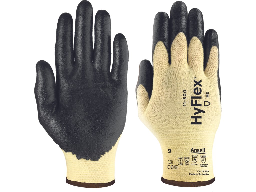 • HyFlex® 11-500 features the ergonomically designed DuPont™ Kevlar® stretch liner with spandex, which provides 'second skin' closeness, reducing risk of snags and cuts • gloves mold to hand, reducing fatigue, and the superior fit provides greater comfort, dexterity and flexibility • additionally, gloves are silicone free and latex free for worker and product protection • gloves hide soil, providing longer wear and reducing over-all replacement costs