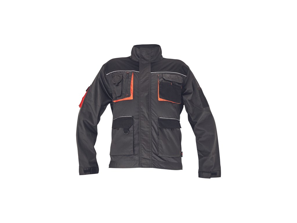 • pánska pracovná bunda • vystužené ramená • 2 veľké vrecká • 2 náprsné vrecká na suchý zips • 1 vrecko na rukáve • zapínanie na klopu • elastický pás a konce rukávov • reflexné prvky