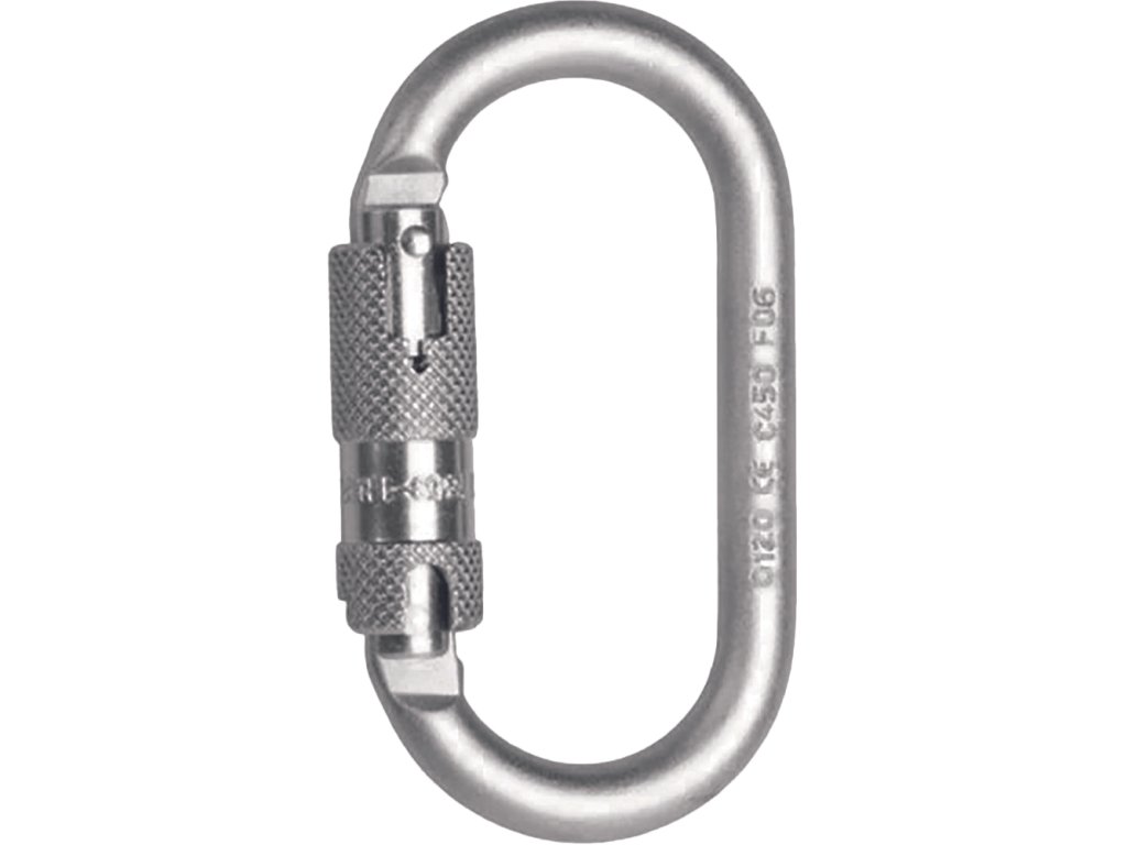Oceľová oválna karabína s twist lock poistkou. Pevnosť 25kN, otvorenie 19mm, váha: 0,17 Kg, rozmer: 59x110mm, CE EN362-B EN12275-H