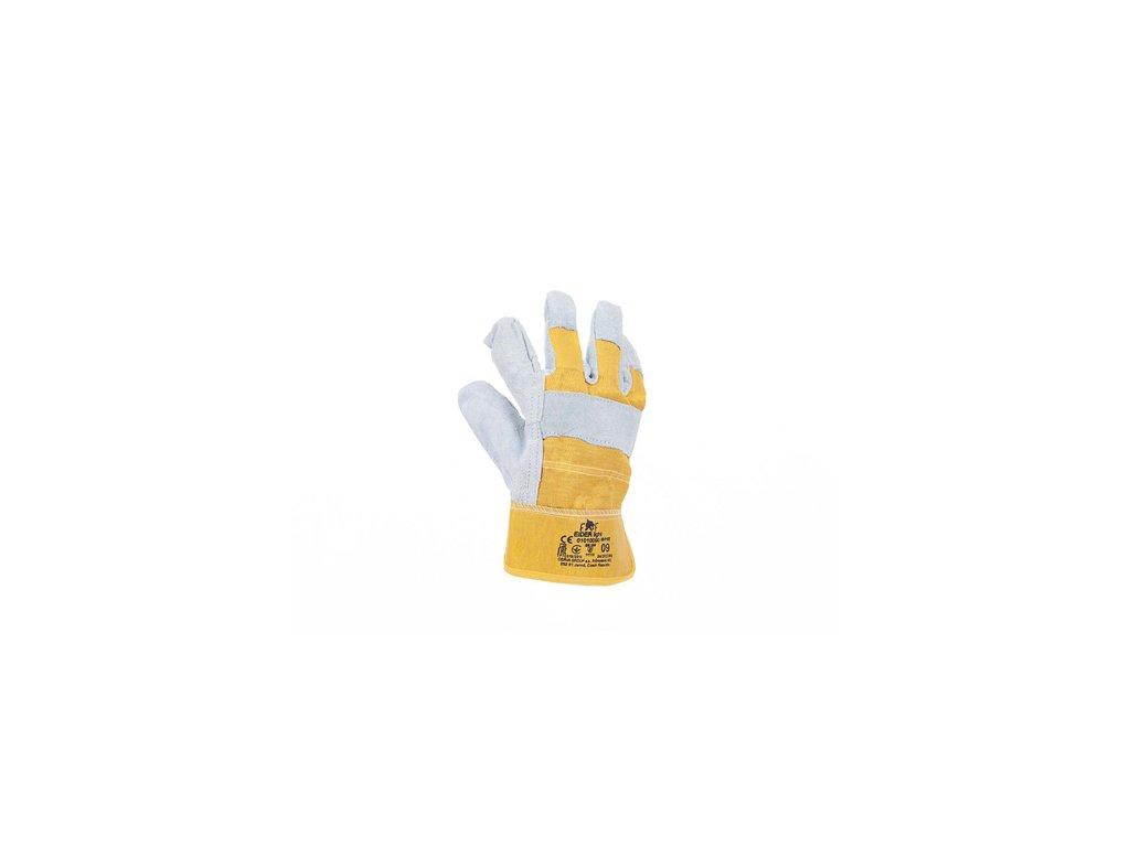 • rukavice vyrobené z hovädzej štiepenky • v dlani s podšívkou • tkanina na chrbte • celokožené palce a prekryté špičky prstov