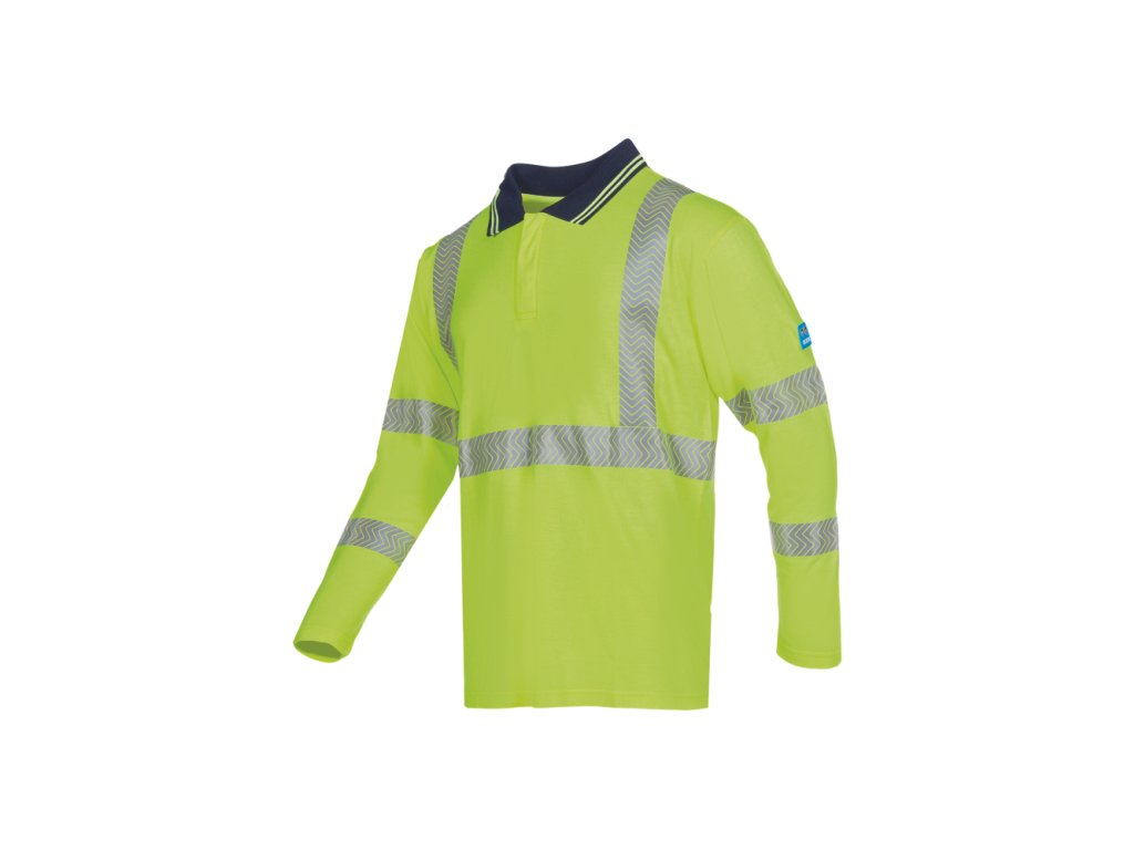• pánske HI-VIS polo tričko s dlhým rukávom • odolné statickej elektrine, teplu a UV slnečnému žiareniu • tlačené reflexné pruhy cez ramená, hruď a rukávy