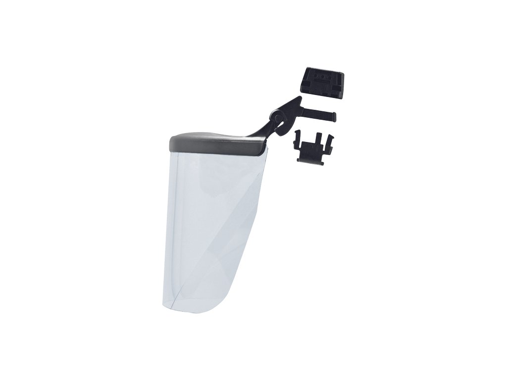 Carrier and 20cm Polycarbonate Visor for Evolution® Safety Helmets; offers protection against medium energy high-speed particles at 120 m/s (270 mph), liquid droplets and molten metal. Markings: EN 166 1.B.3.9