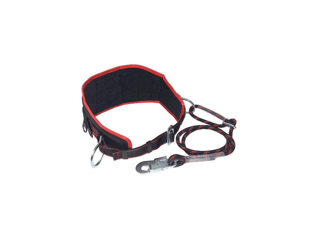 Pracovný polohovací pás s bedrovou výstuhou, polohovacími okami a sponou pre nastavenie veľkosti, pútkami pre pripojenie tašky na náradie, univerzálnym bezpečnostným 1,5 m dlhým lanom s nastavovačom a oceľovou karabínou s poistkou, spĺňa normy EN 362, EN 354, EN 358 (CE 0082).