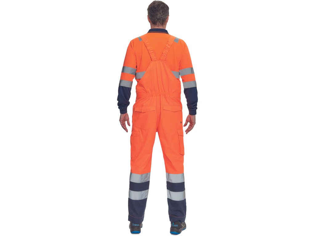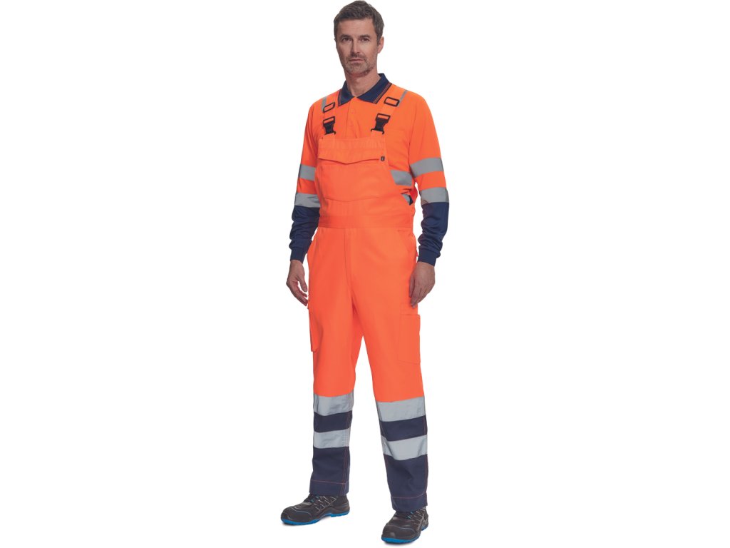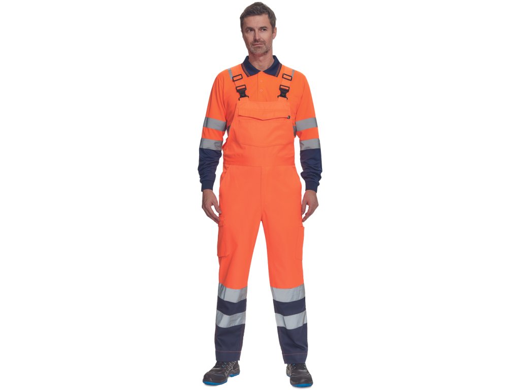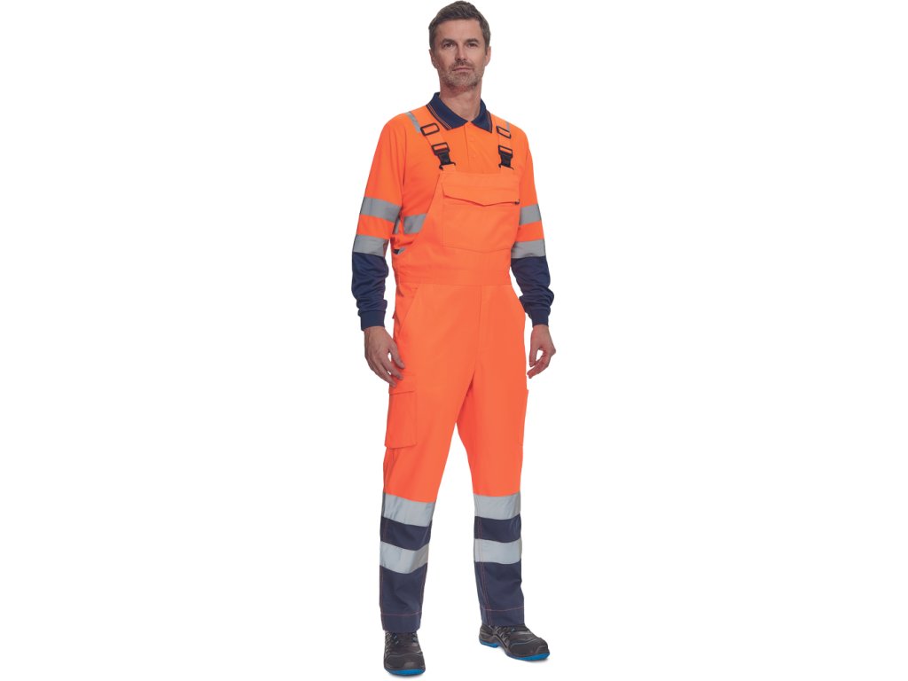 • pánske Hi-Vis pracovné nohavice s náprsenkou a s reflexnými doplnkami o veľkosti 7 cm • elastický pás • 2 bočné vrecká + 1 vrecko na drobné • 2 multifunkčné stehenné vrecká • 2 zadné vrecká • 1 veľké multifunkčné náprsné vrecko • elastické traky so zapínaním na sponu • nastaviteľná dĺžka nohavíc