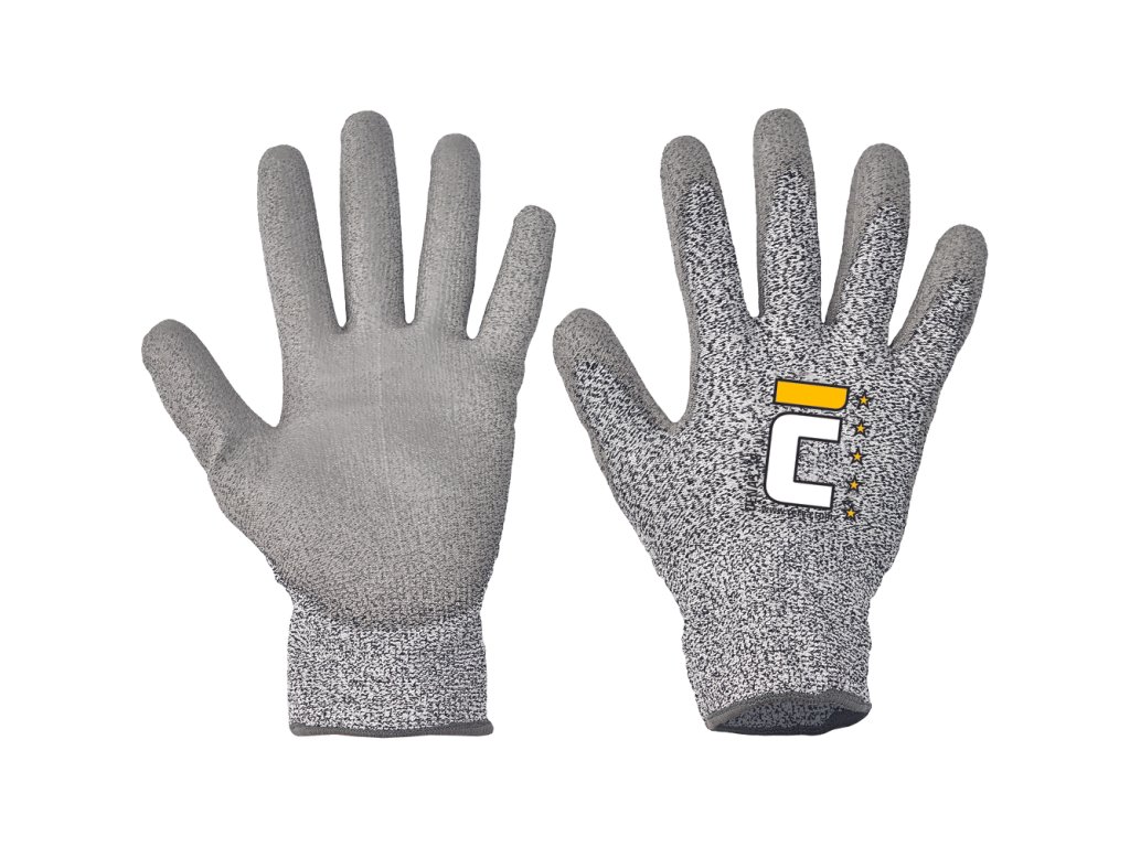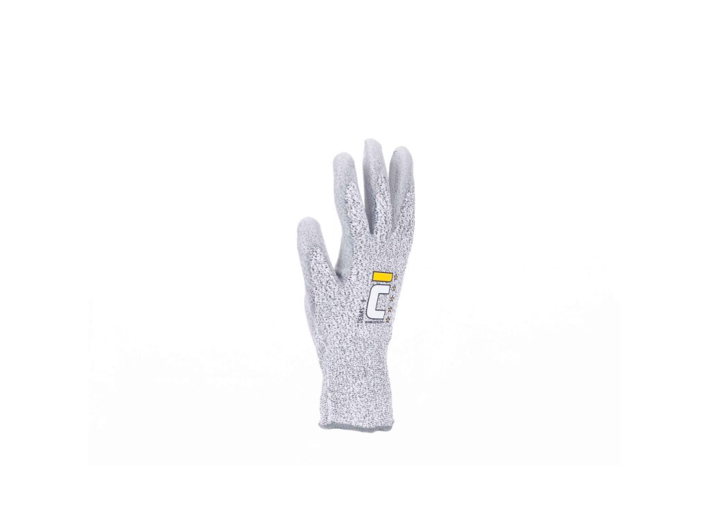 • pletené bezšvové rukavice s obsahom vlákna DYNEEMA a nylonu s vysokou odolnosťou proti prerezu ostrím • vrstva sivého PU v dlani a na prstoch