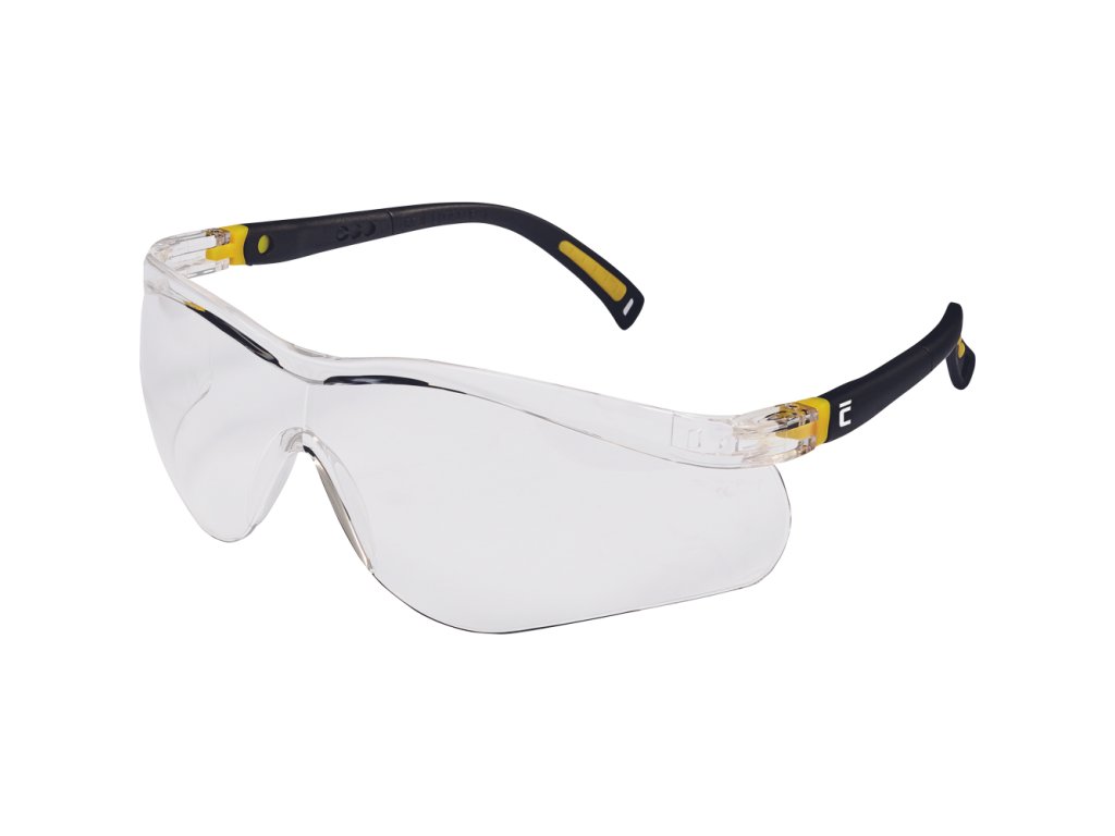 Okuliare s polykarbonátovým zorníkom, nastaviteľným uhlom a dĺžkou stranníc, športovým vzhľadom, zorník s úpravou proti poškriabaniu a oroseniu, trieda F podľa normy EN 166, ochrana proti nárazu s malou energiou, optická trieda 1, žltý zorník s ochranným filtrom proti UV žiareniu podľa normy EN 170.
