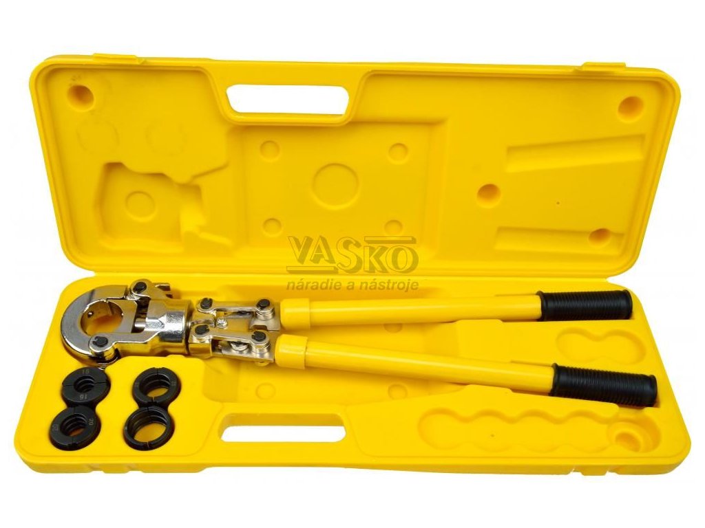 Pákové krimpovacie-lisovacie kliešte PEX-AL-PEX. Lisovací nástroj na pripojenie PEX spojok lisovaním k rúrke. Vymeniteľné matrice umožňujú prácu v celej škále priemerov rúrok od 16 mm do 32 mm.