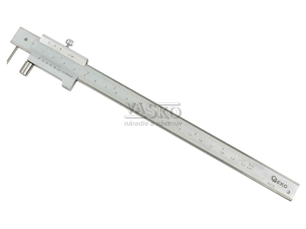 Značkovacie posuvné meradlo s pracovnou dĺžkou 200 mm a presnosťou 0,05 mm. Určené na presné značenie pomocných čiar na obrobkoch. Obzvlášť užitočné na vŕtanie, frézovanie, sústruženie atď. Vyrobené z nehrdzavejúcej ocele, má kalenú oceľovú dosku (druhá doska je súčasťou balenia). Stupnica je v mm a palcoch.