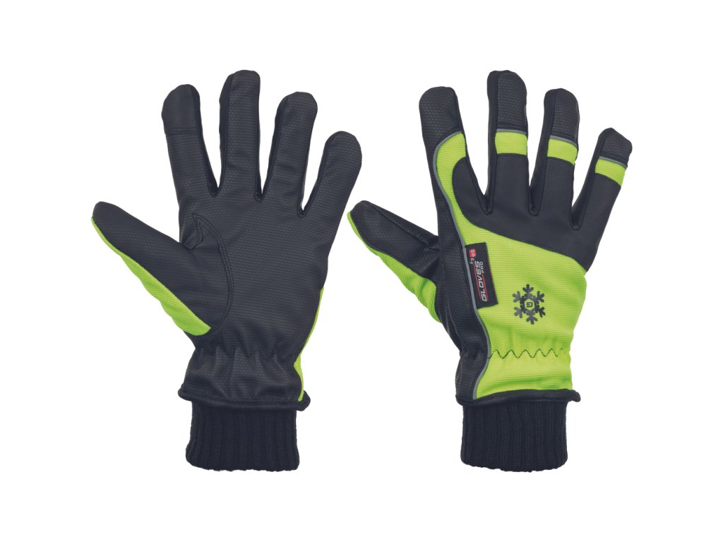 • zimné päťprstové rukavice z čiernej polyuretánom potiahnutej tkaniny (PUR) s membránou a flísovou podšívkou • chrbát z polyamidového úpletu • elastická manžeta • vhodné pro ovládání dotykových displejů