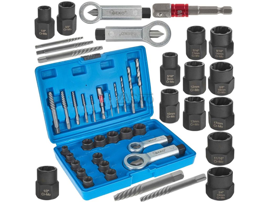 Sada vyťahovačov zalomených skrutiek a poškodených matíc, 26-dielna, GEKO
