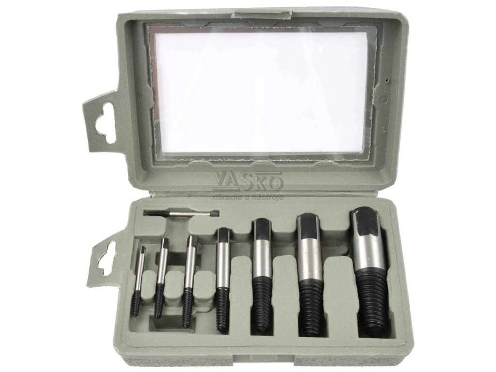 Sada 8 extraktorov rôznych veľkostí určených na odstránenie zlomených alebo poškodených skrutiek, čapov atď.