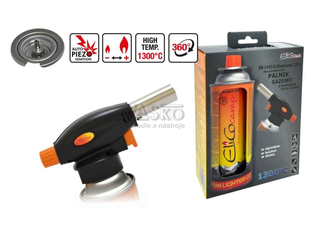Spájkovacia lampa s piezo zapaľovačom a kartušou 220g, otočný uzáver, ELICO