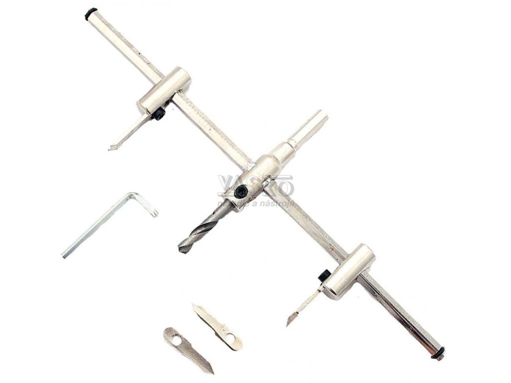 Dierovacia píla 40-300mm na sadrokartónové dosky je určená na rezanie otvorov rôznych veľkostí do sadrokartónových dosiek. Má dva silné nože s SK plátkom, ktoré sú umiestnené na každom z ramien dierovej píly. Šírka ramena je 320 mm. Dierovacia píla je vhodná aj na rezanie stredových otvorov do dreva alebo sadrokartónu. Je vybavená dlhým vodiacim rámom, vrtákom a čepeľami z kalenej ocele, ktoré umožňujú ľahké rezanie otvorov napríklad pre potrubie. Výrobok je možné namontovať do vŕtačky alebo skrutkovača. Najprv nastavte čepele na zvolené miesto pomocou imbusovej skrutky a potom pripojte dierovaciu pílu k hlave vŕtačky alebo skrutkovača. Pracovný rozsah dierovacej píly je od 40 mm do 300 mm. Sada obsahuje čepele, imbusový kľúč a samotnú dierovaciu pílu.