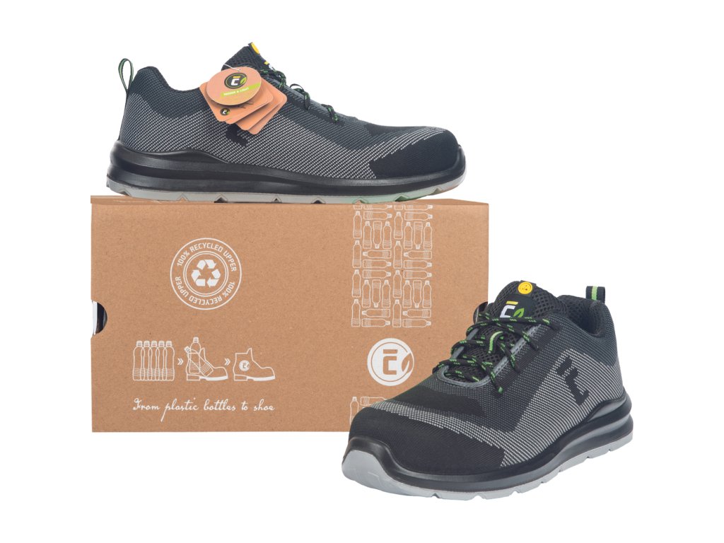 GRS certified safety footwear. Zurrum ECO S1PS safety shoe is an alternative of favorite model Zurrum S1P which is partly produced from recycled materials. The total weight of recycled parts is 23 % (120 g out of total 521 g for size 42). Textile upper made from 100 % recycled polyester, insole contains 90 % of recyclate and anti-penetration midsole contains 60 % of recycled plastics in its composite structure. Composite toe cap. Comfortable double-density PU/PU outsole. Antistatic, ESD footwear. Breathable indoor safety footwear.